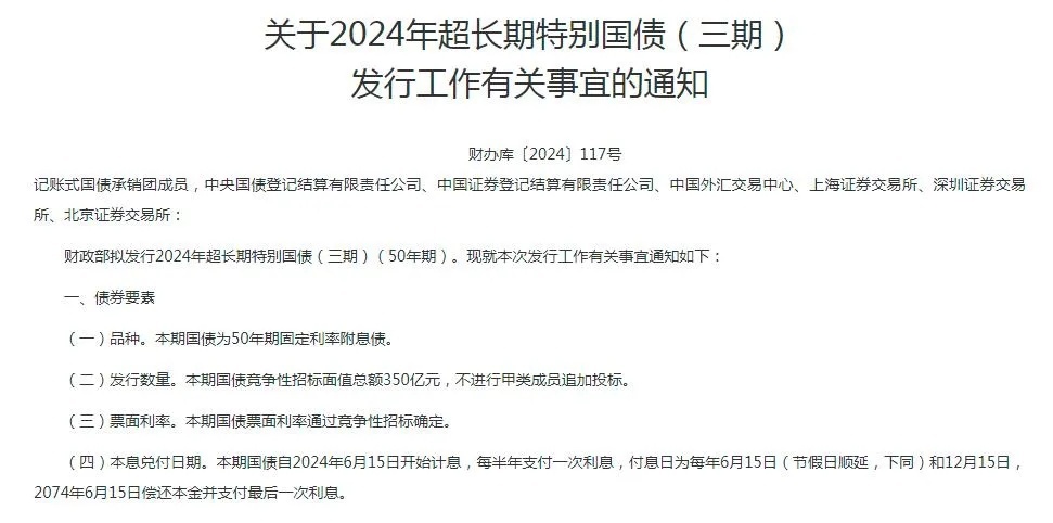 财政部近日发布《关于2024年超长期特别国债(三期)发行工作有关事宜的通知》,明确了50年期特别国债的发行安排。