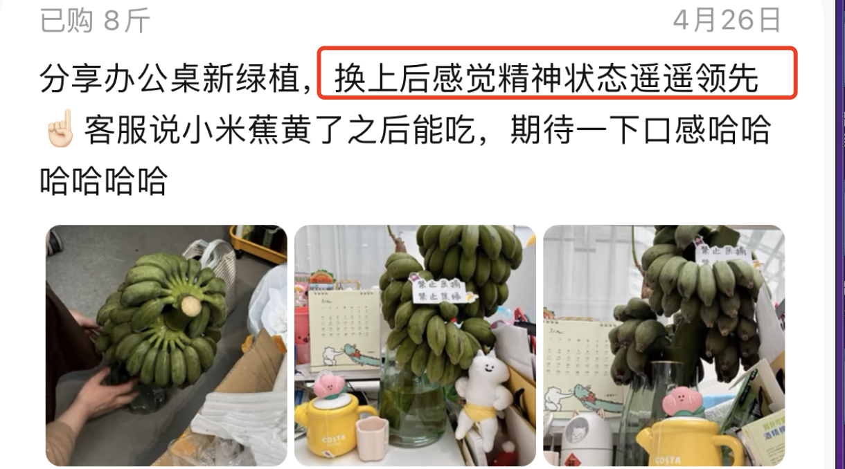 售价23.8元的小米蕉带着果竿,历经4天路途从南宁抵达成都的写字楼,最后挂上一张写着“禁止蕉绿”的卡通卡片被精心安置在胡玲的工位上。“选购标重是5斤,送到时果实基本都是绿的,等了5天左右开始发黄,总是想抬头看它一眼。”胡玲说,看到工位上每天都在发生明显变化的植物,能感受到它在变熟阶段的生命力,身上的压力似乎减轻了不少。