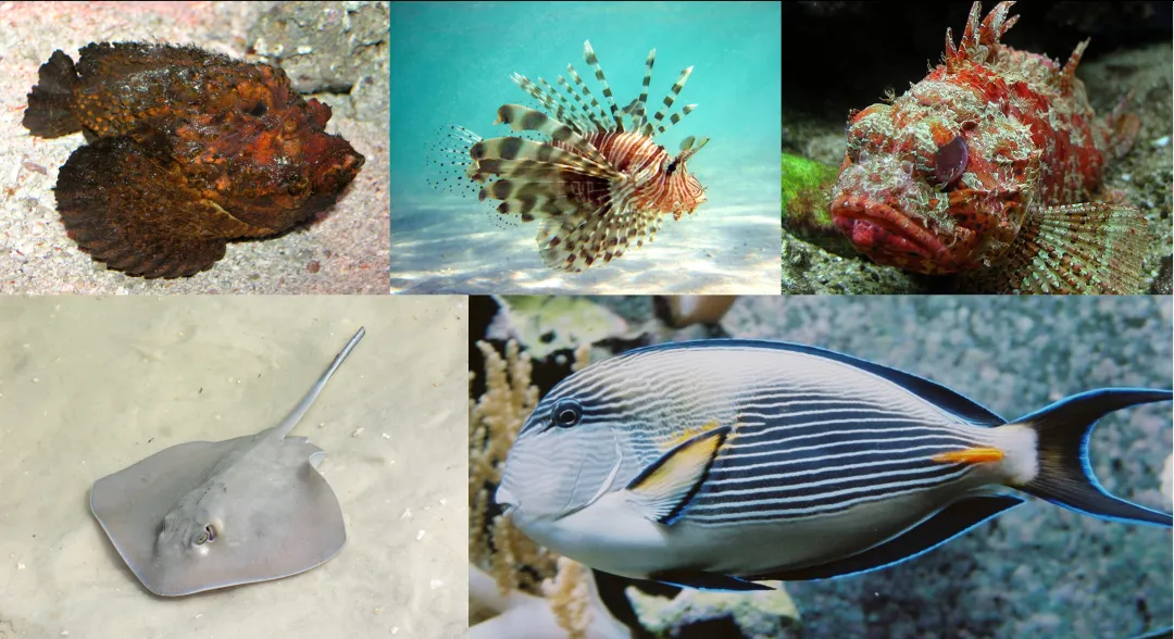 石头鱼、狮子鱼、鲉鱼、鳐鱼和背肋鱼(来源:维基百科)