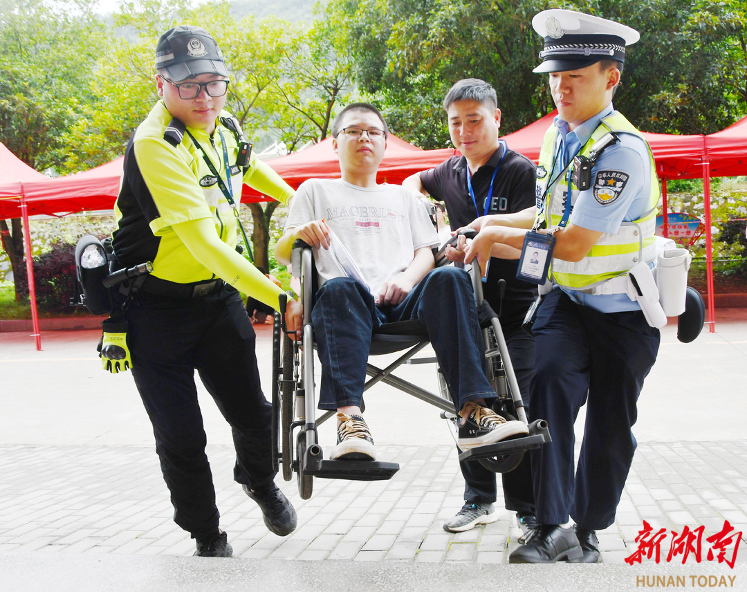6月9日下午6时多,江永县第一中学考点。随着2024年高考最后一门科目结束,考生何红明坐着轮椅,在警察的护送下走出考点。