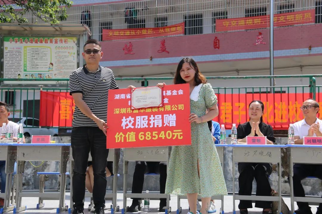 湖南省妇女儿童发展基金会新君子文化基金携手深圳市富华服装有限公司为五龙山中心校捐赠596套校服,价值近7万元。湖南省君子文化研究会捐赠350余册《中华少年君子文化》读本。省君子文化研究会副秘书长刘俐表示,研究会坚持开展少年君子文化教育工程,希望发挥优秀传统文化的“立德树人”作用,培养学生自信自立,保持积极向上的精神面貌,学习传承优秀传统文化,坚持立德修身,从小培育君子人格,担当民族时代重任,走向更广阔的世界。