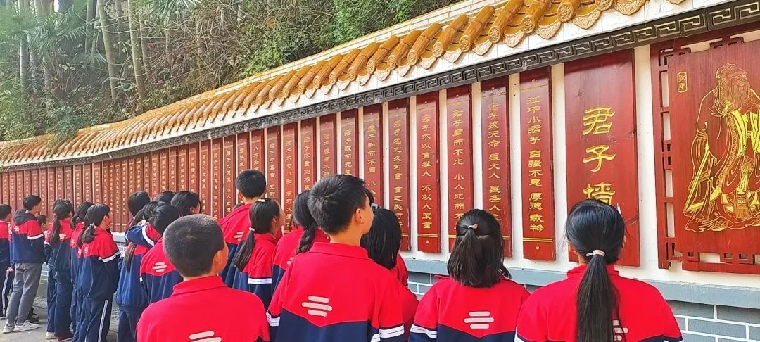 肖桥礅校长介绍,为了深层次地建设好清廉学校,他和管理团队想到了让文化发力助推创建工作。从2018年下学期开始,江口镇中学大力推进国学教育,一直坚持至今。2020年上学期,在校友肖特和该镇德善教育助学协会的大力支持下斥资八万余元为该校修建了“君子墙”,打造了创廉文化阵地。2020年下学期,该校开始着力推进君子文化教育。本学期,为了让君子文化教育步入正规化、专业化的道路,该校成立了由八位经过学校严格选拔的优秀青年教师组成的君子文化讲师团,由讲师团全面负责学校的君子文化教育工作。目前,该校君子墙上的四十九句关于君子的经典名言和由湖南省君子文化研究学会会长李利君、国学教育专家、韶山南岸国学院名誉院长刘孝听共同创作的《少年君子赋》是全校学生的君子文化通学知识。在君子文化大讲堂上,六年级主讲《孝经》、七年级主讲《论语》、八年级主讲《 道德经》,师生所用的国学教材全部由该镇德善教育助学协会赞助提供。君子文化大讲堂自开讲以来 , 由于讲师团成员的认真备课、精彩授课,受到了各年级师生的一致热捧。肖校长风趣而又自豪地说道,该校君子文化讲师团应该是目前全县农村学校传承和弘扬中华优秀传统文化和清廉文化的第一支正规军,这也是该校打出的第一面文化旗帜。