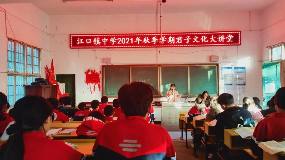 2021年12月23日下午4点20分,洞口县江口镇中学八年级一百八十余名学生正在该校君子文化大讲堂认真聆听由贺艳平老师带来的精彩讲座。讲座过程中,学生们时而认真地做着笔记,时而跟着老师大声朗读着《 道德经》里的经典章节,时而专注地倾听老师讲述的哲理小故事,时而有序地进行师生互动答疑,整个大讲堂严谨而不失活泼,文化气息和生活气息都很浓厚,同堂听课的还有该校其他十余位教师。这一幕,是该校自2019年下学期创建清廉学校以来,主动抢占阵地、创新建设手段,以君子文化教育为抓手助推清廉学校建设工作的一个缩影。