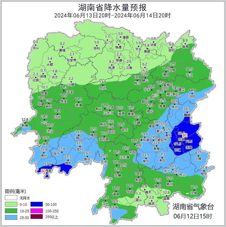 6月13日晚上到14日白天,湘中、湘南阴天有中到大雨,其中株洲(茶陵、醴陵、攸县)、邵阳(城步)、怀化(通道)、衡阳(衡东)、郴州(安仁)有暴雨,其他地区多云间阴天有阵雨或雷阵雨;南风2~3级;最高气温湘北33~35℃,其他地区29~31℃;最低气温湘西22~24℃,其他地区24~26℃。