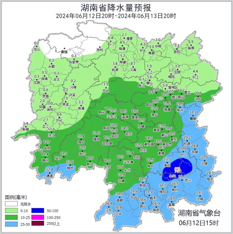 6月14日晚上到15日白天,湘中、湘南阴天有中到大雨,其中株洲(市区、醴陵、攸县)、永州(市区、道县、东安、江永、双牌)、衡阳(衡东)有暴雨,其他地区多云间阴天有阵雨或雷阵雨;南风2~3级;最高气温湘北、湘中31~33℃,其他地区28~30℃;最低气温23~25℃。