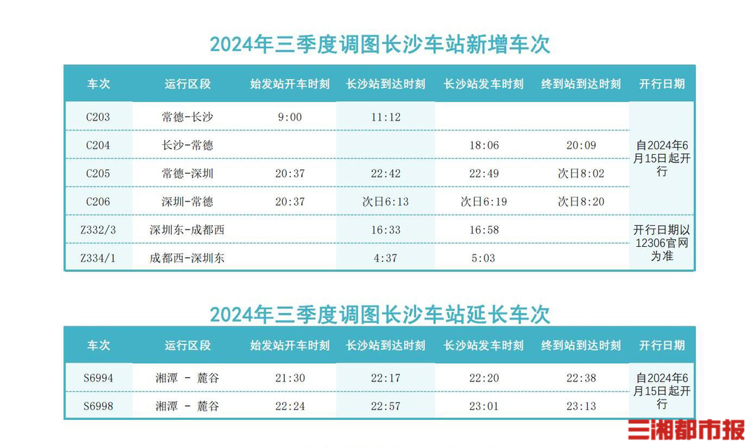 三湘都市报·新湖南客户端6月13日讯(全媒体见习记者 李致远 通讯员 潘梦冉)6月13日,记者从长沙火车站获悉,长沙火车站三季度运行图于6月15日0时开始实行。
