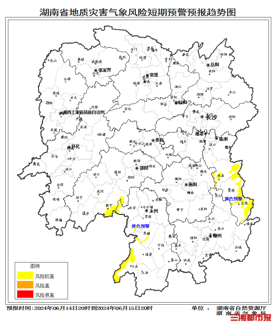 三湘都市报·新湖南客户端6月14日讯(全媒体记者 潘显璇 通讯员 刘泉子)根据地质灾害成灾规律和孕灾条件,结合2024年6月14日短期气象预报情况,湖南省自然资源厅与省气象局联合发布地质灾害黄色预警:自6月14日20:00至15日20:00,受降雨影响,湘南部分区域发生突发性地质灾害风险较高。