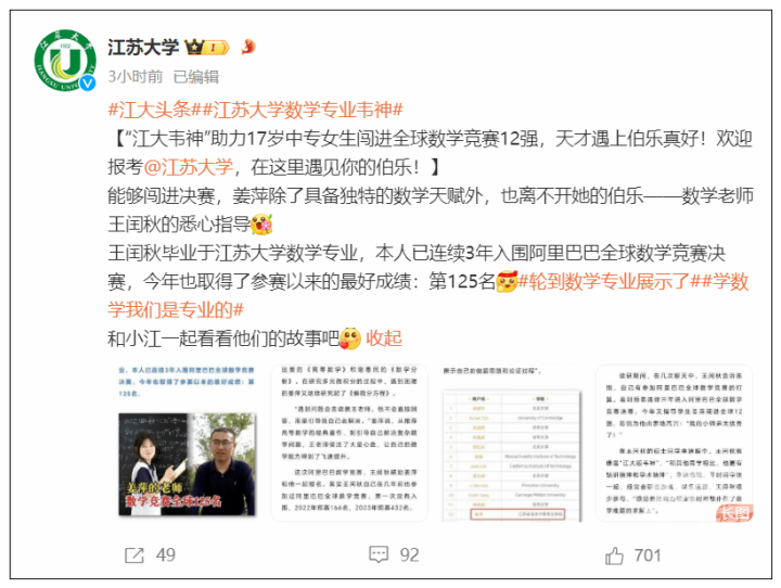 今天,江苏大学冲到了热搜二。他们趁着这把热度,给自己做起了招生广告:“江大韦神”助力17岁中专女生闯进全球数学竞赛12强,天才遇到伯乐真好!欢迎报考江苏大学,在这里遇见你的伯乐。