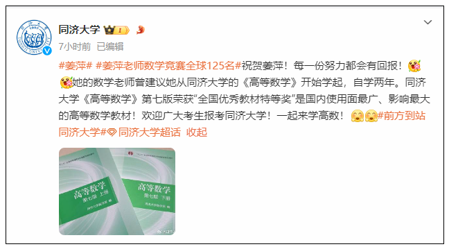 姜萍的优秀,也引来了更多高校的橄榄枝。@同济大学发博祝贺姜萍:“每一份努力都会有回报。欢迎广大考生报考同济大学,一起来学高数!”王老师此前向姜萍推荐的自学数学教材中,第一本便是同济大学出版的《高等数学》。