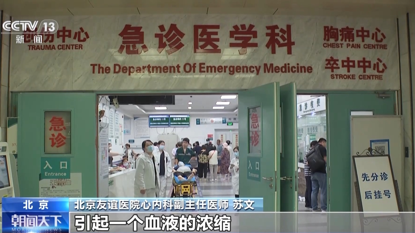 北京友谊医院心内科副主任医师 苏文:我们知道大量的出汗,引起一个血液的浓缩,那么通常来说血液比较黏稠,这个时候也是容易出现一些心血管的急症。