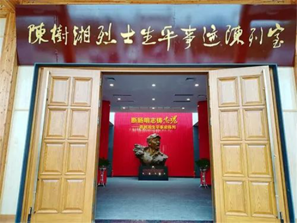 陈树湘烈士生平事迹陈列室,位于永州道县梅花镇贵头村的道县烈士纪念园内。陈列室按照湘南民居风格设计建造,主馆外围边长为34米,代表红三十四师;内围边长为29米,寓意陈树湘烈士牺牲时年仅29岁。陈列室以“断肠明志铸忠魂”为主题,分为“坚定信仰”“听党指挥”“牢记使命”“绝对忠诚”四部分,展示了陈树湘烈士光辉的革命历程、伟大的英雄壮举和“断肠明志”为苏维埃流尽最后一滴血的感人故事。2019年,陈树湘烈士生平事迹陈列室入选湖南省爱国主义教育基地,共接待各单位团体2000多个,参观人数达40万人次。