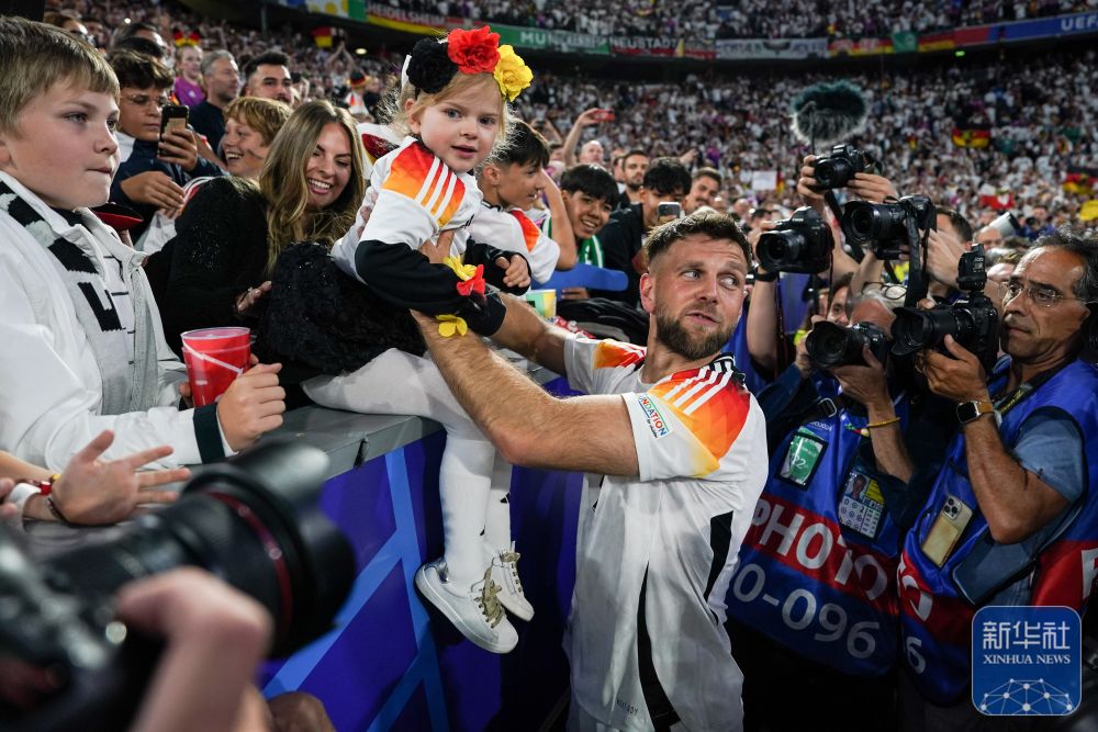 ↑德国队球员尼克拉斯·菲尔克鲁格在比赛后将女儿抱下看台。新华社记者 彭子洋 摄