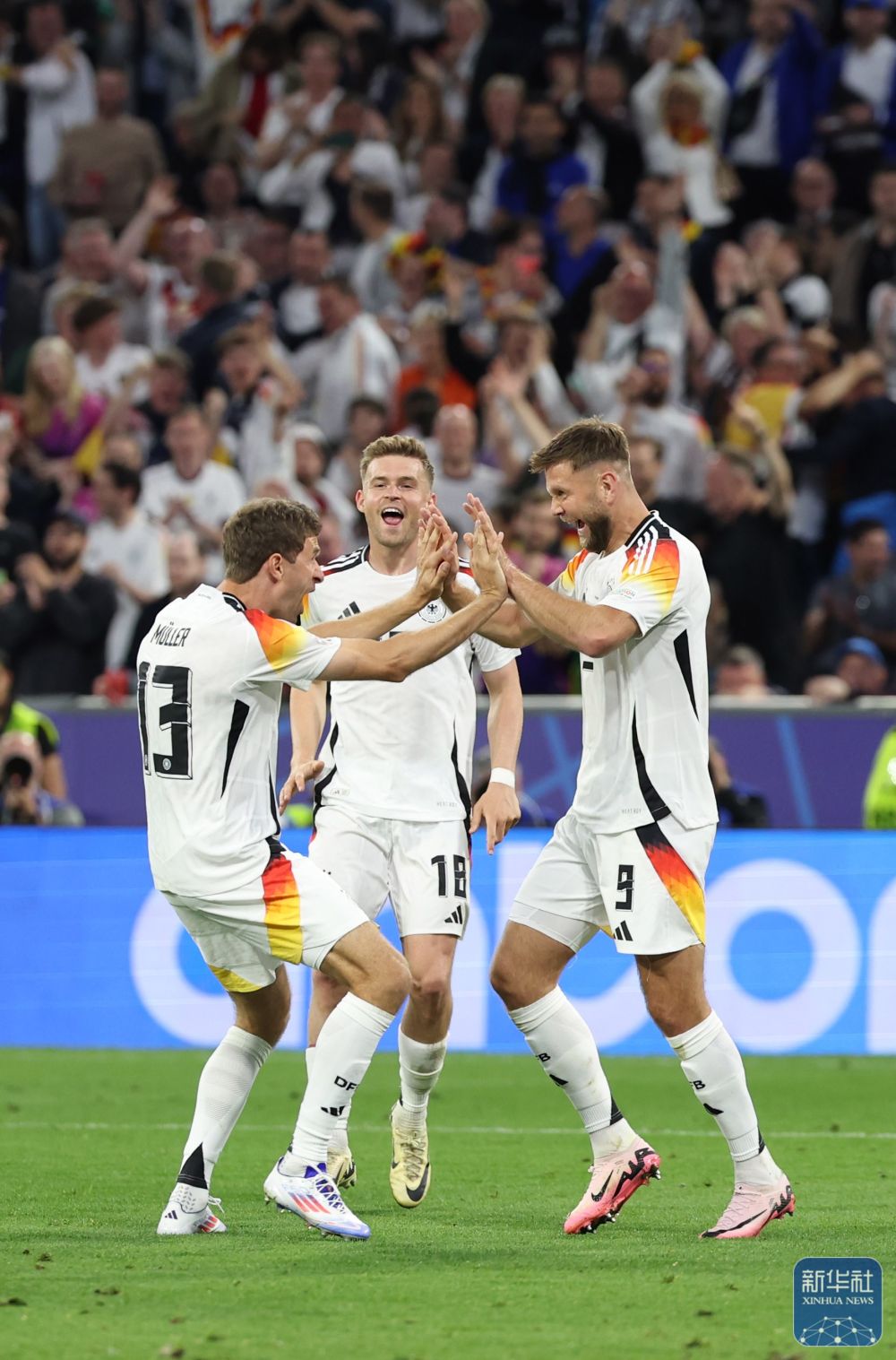 ↑德国队球员弗洛里安·维尔茨(右)打进首粒进球后庆祝。新华社记者 彭子洋 摄