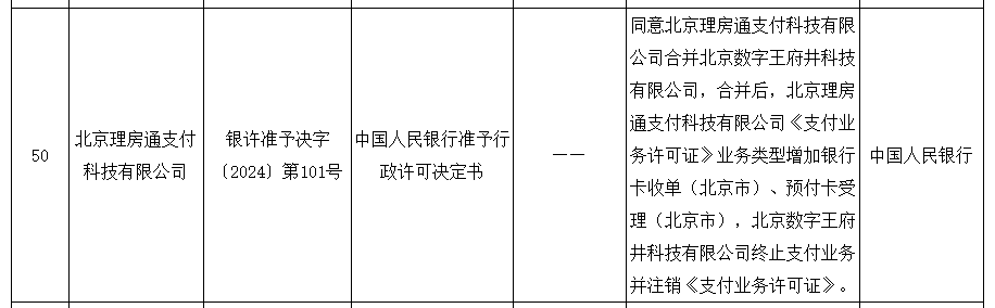 人民银行官网显示,人民银行同意北京理房通支付科技有限公司合并北京数字王府井科技有限公司。合并后,北京理房通支付科技有限公司《支付业务许可证》业务类型在互联网支付的基础上,增加银行卡收单(北京市)、预付卡受理(北京市)。而北京数字王府井科技有限公司终止支付业务并注销《支付业务许可证》。