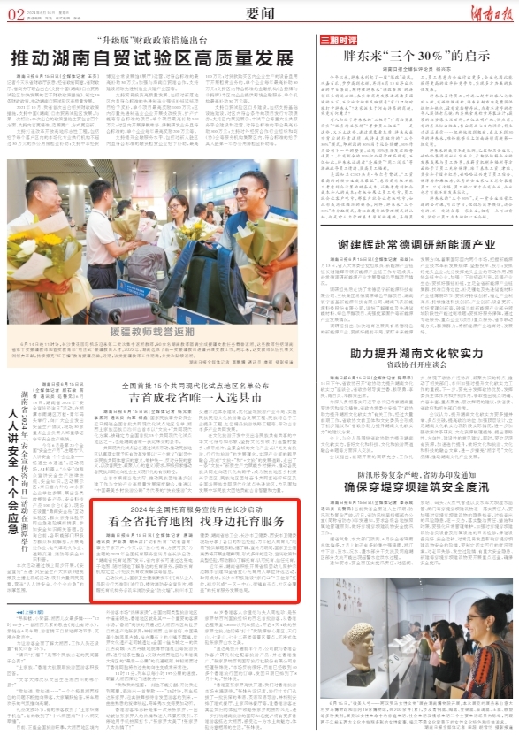 全力做好0-3岁婴幼儿托育服务,是推动人口高质量发展的重要基础。近年来,全国各地积极探索,其中,江苏、浙江等多个省份将托育服务列入为民办实事项目,湖南省积极开展省级婴幼儿照护示范城市创建和全省爱心托育用人单位评选活动,取得积极成效。长沙市积极建设“家门口”“工位旁”托位,发挥市、区两级托育综合服务中心示范引领作用,社区托育点、幼儿园托班、企业托育园、家庭托育点协同并进,初步形成“一区一中心,街镇有布点,社区全覆盖”的托育服务发展格局,为市民提供便捷、优质的托育服务。