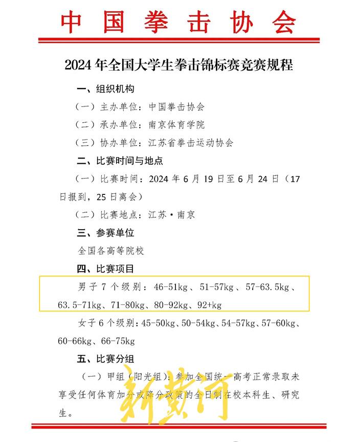 记者了解到,小许报名参加的比赛是6月19日至6月24日在南京举办的2024年全国大学生拳击锦标赛,具体为男子46-51kg级别。日前,本次赛事主办方相关人员也向记者证实,小许参加的是丙B组(高水平B组)的比赛。据赛事主办方人员透露,小许目前仍在选手名单上,主办方尚不知晓其已经去世。当被问及参赛选手是以个人还是学校身份竞赛时,工作人员称选手代表学校,“我们只接受学校报名,而且报名表也是学校盖章的,我们为了避免个人报名出问题,所以才找学校报名的。”此外,该工作人员表示,拳击运动员在赛前减重并不罕见,对于小许的离世,其希望家属节哀,并表示由于是在备赛期间,家属还应与校方进行沟通商议。