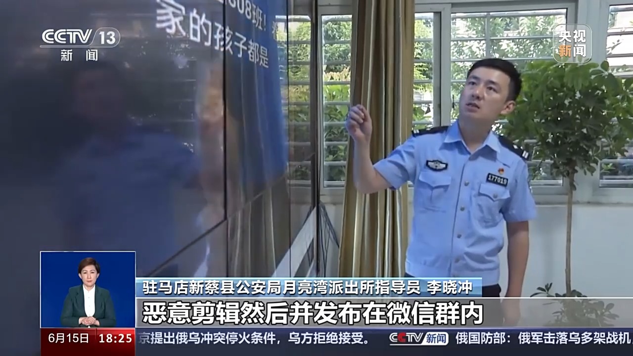河南驻马店新蔡县公安局月亮湾派出所指导员李晓冲:曹某交代,自己不懂法律,为了博取关注,在网上下载一个打架的视频,并配上“新蔡县某某中学,看看谁家”的孩子等字样,在网上通过一些编辑软件进行编辑、恶意剪辑并发布在微信群里。
