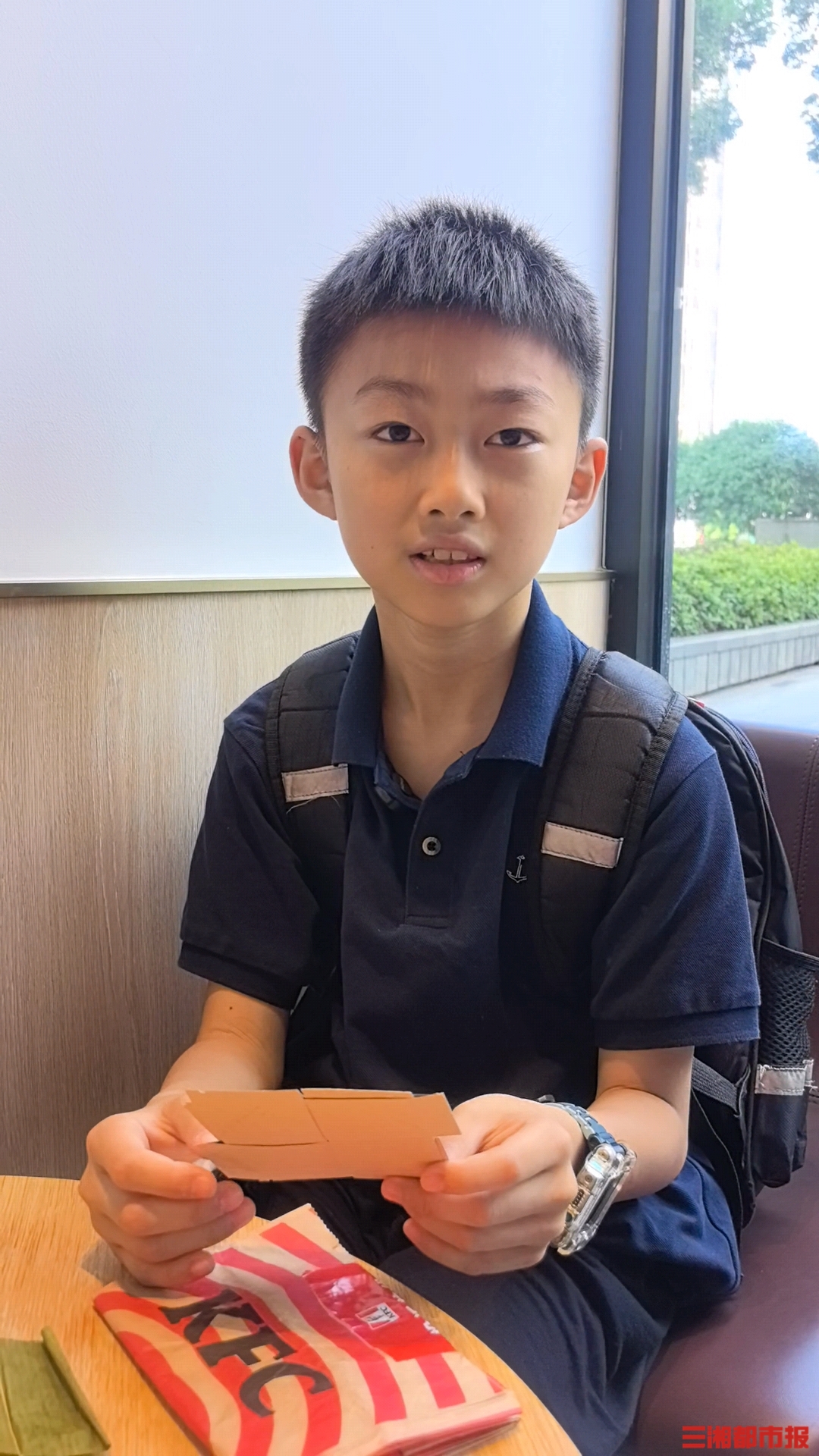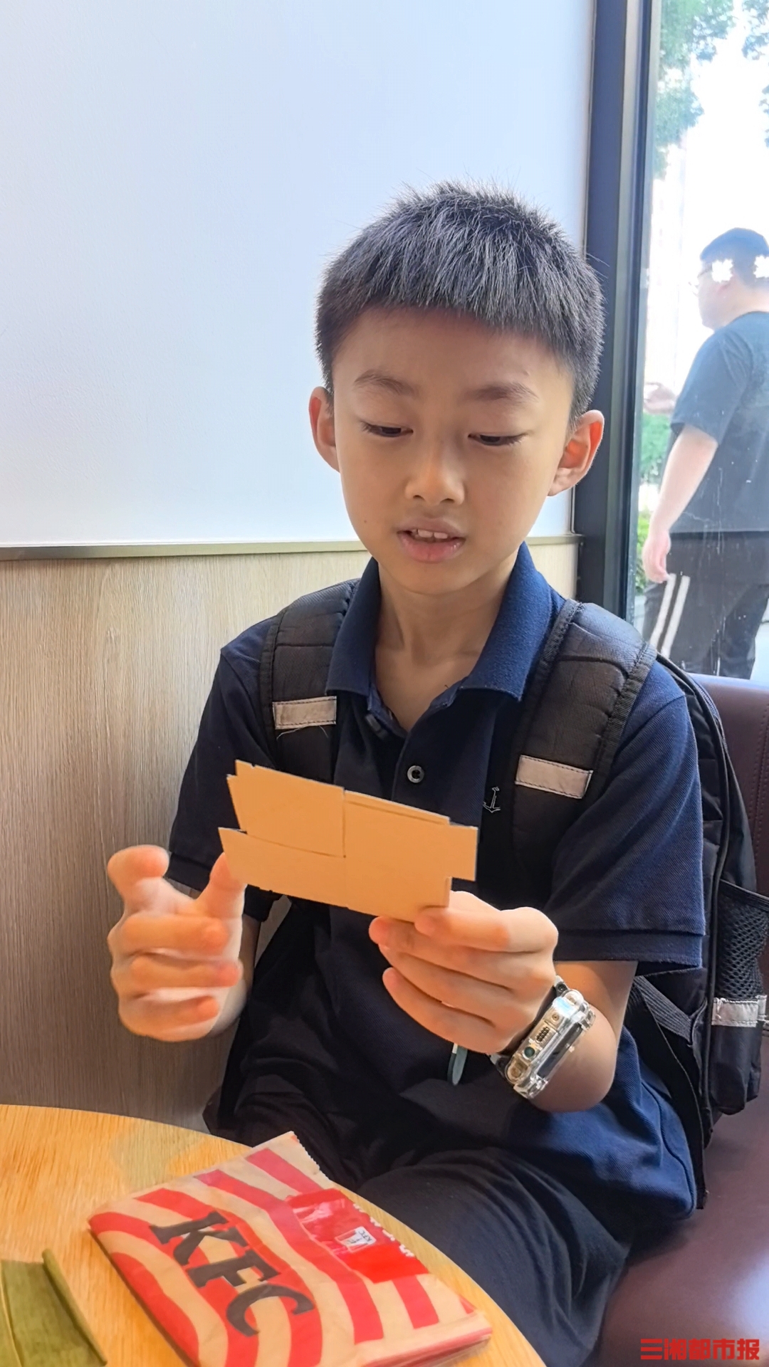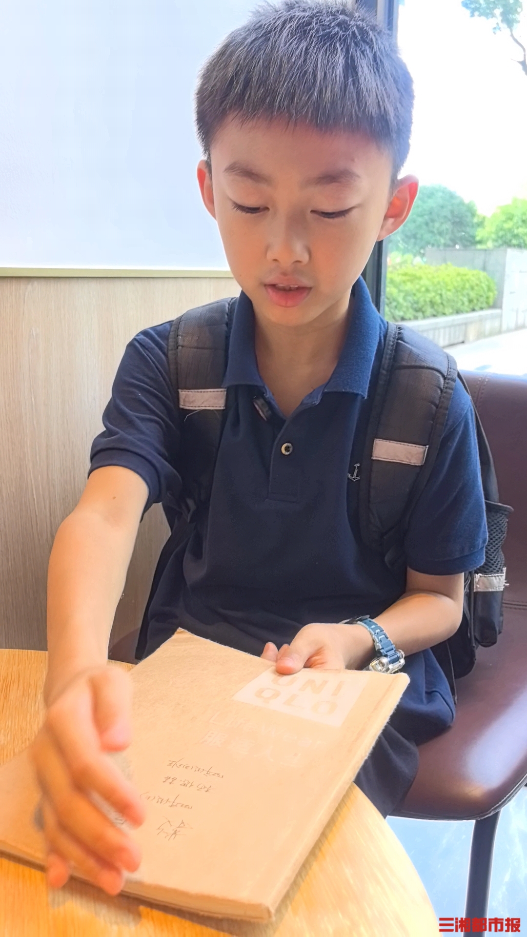 “这是快餐店的纸袋,吃完里面的食物,把纸袋留着,乘坐高铁时使用,就可以不拆用新的垃圾纸袋了。”杨偲喆告诉三湘都市报记者,还可以用废旧纸袋做包书纸。他从包里拿出一本数学教科书解释道,“买了衣服回家后,我就用商店装衣服的纸袋用来包书本,不仅漂亮,也很实用。”