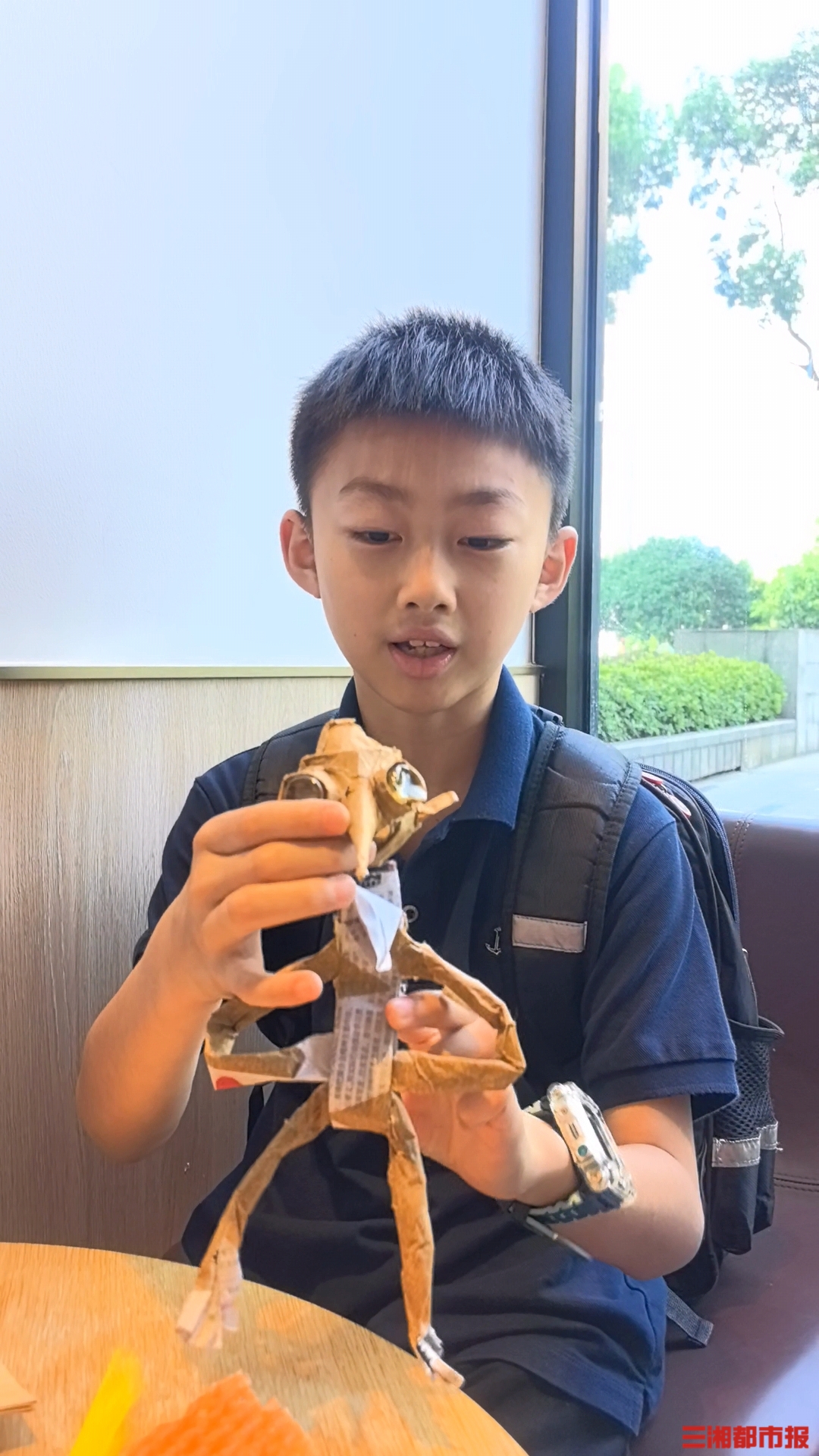 杨偲喆来自长沙仰天湖赤岭小学,他的妈妈张铮介绍,“大概从幼儿园开始,儿子就会动手利用家里的一些瓶瓶罐罐、废纸壳等尝试做些小玩意。”张铮喜欢喝咖啡,拆开食用后留下的挂耳包纸质外包装,被杨偲喆用来做杯垫,“裁剪成4条长方形,交叉相叠,就变成了一个正方形隔热杯垫。”