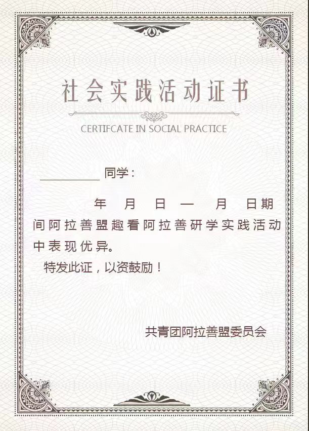 社会实践是提升学生技能和素质的有效途径。共青团阿拉善盟委员会颁发的《社会实践活动证书》,是对学生社会实践的认可和肯定。