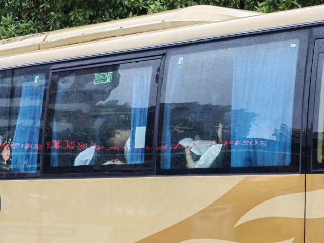 6月18日,2024年长沙市初中学业水平考试北雅中学考点,中考生坐在送考车上复习。
