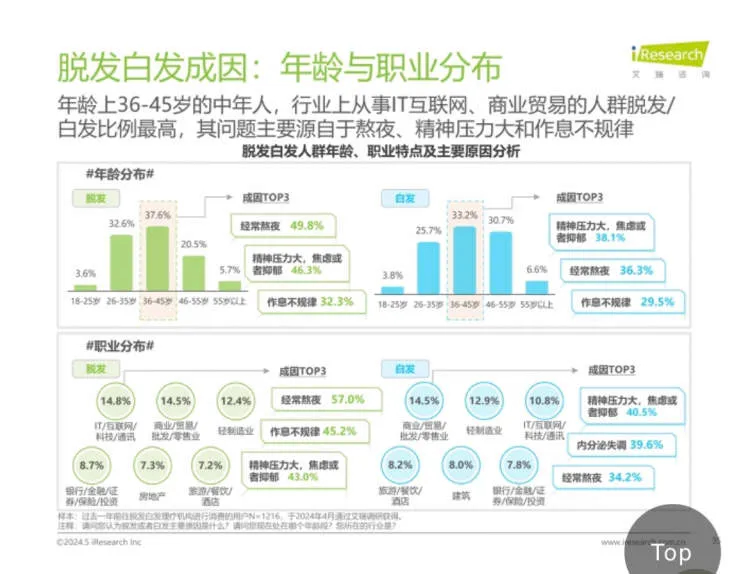 根据艾瑞咨询发布的《2024年中国脱发白发理疗产业洞察报告》,年龄36-45岁的中年人,从事IT互联网、商业贸易的人群脱发/白发比例最高,其问题主要源自熬夜、精神压力大和作息不规律。