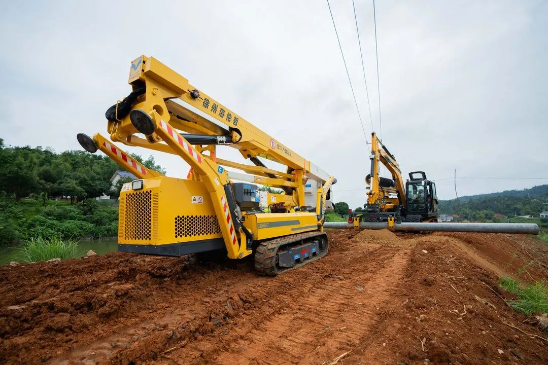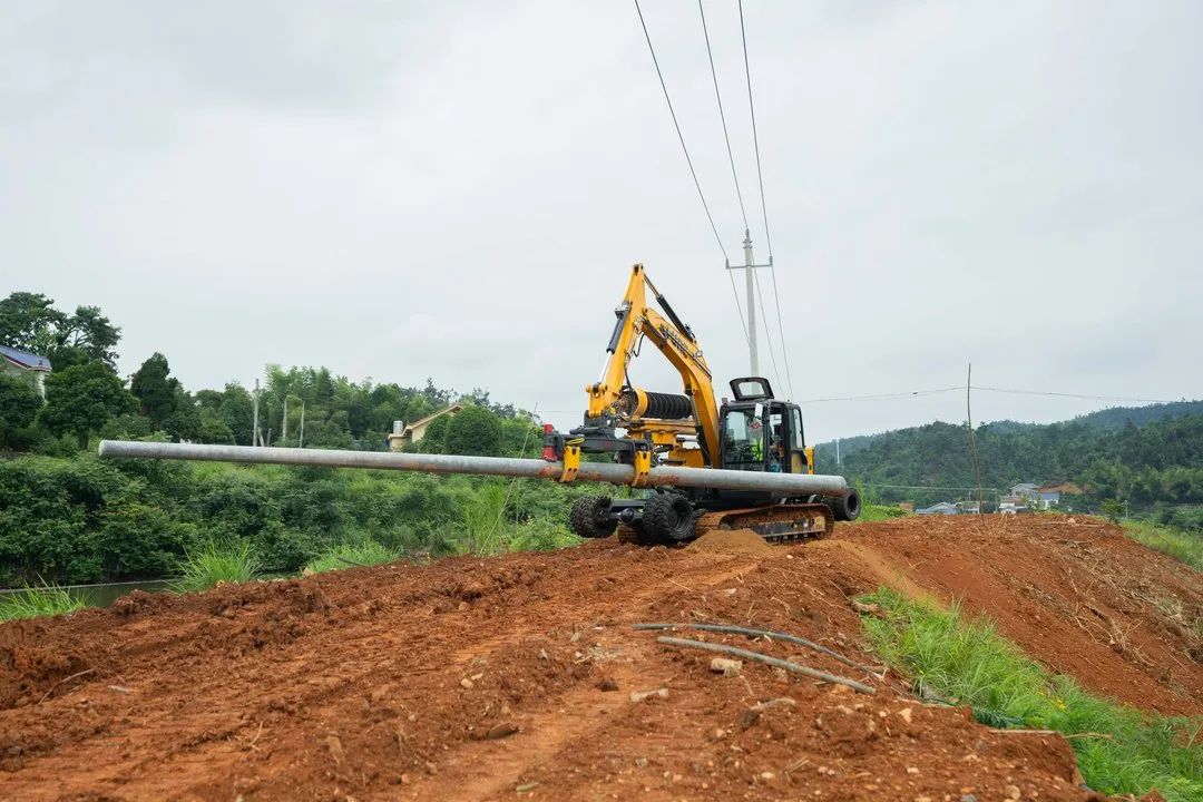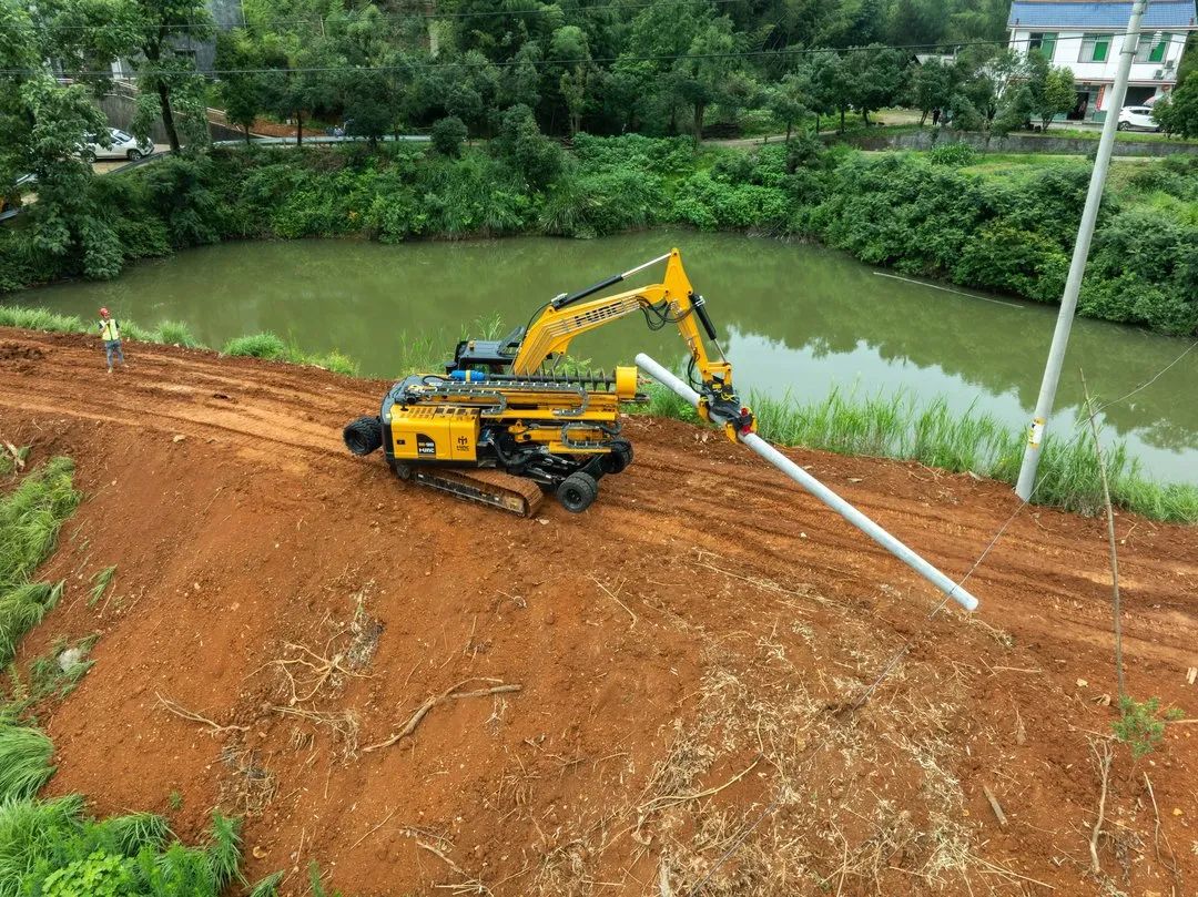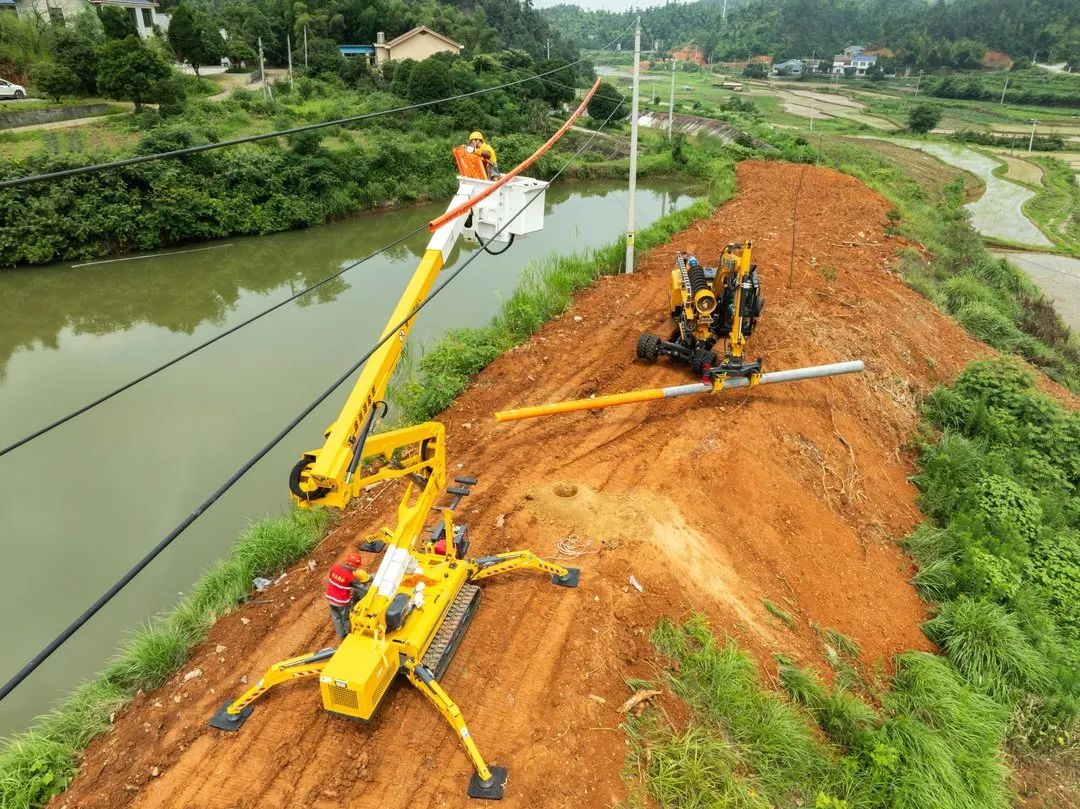 在施工现场,工作人员开进配网机械化施工一体机,因其配备有宽大的履带,面对泥泞的农用道路也如履平地。抵达作业点后,一体机随即高高竖起钻臂,不一会儿,就钻出新的孔洞。收好钻臂后,又神奇地换上抓具,几百斤重的水泥电杆就被稳稳抓住……