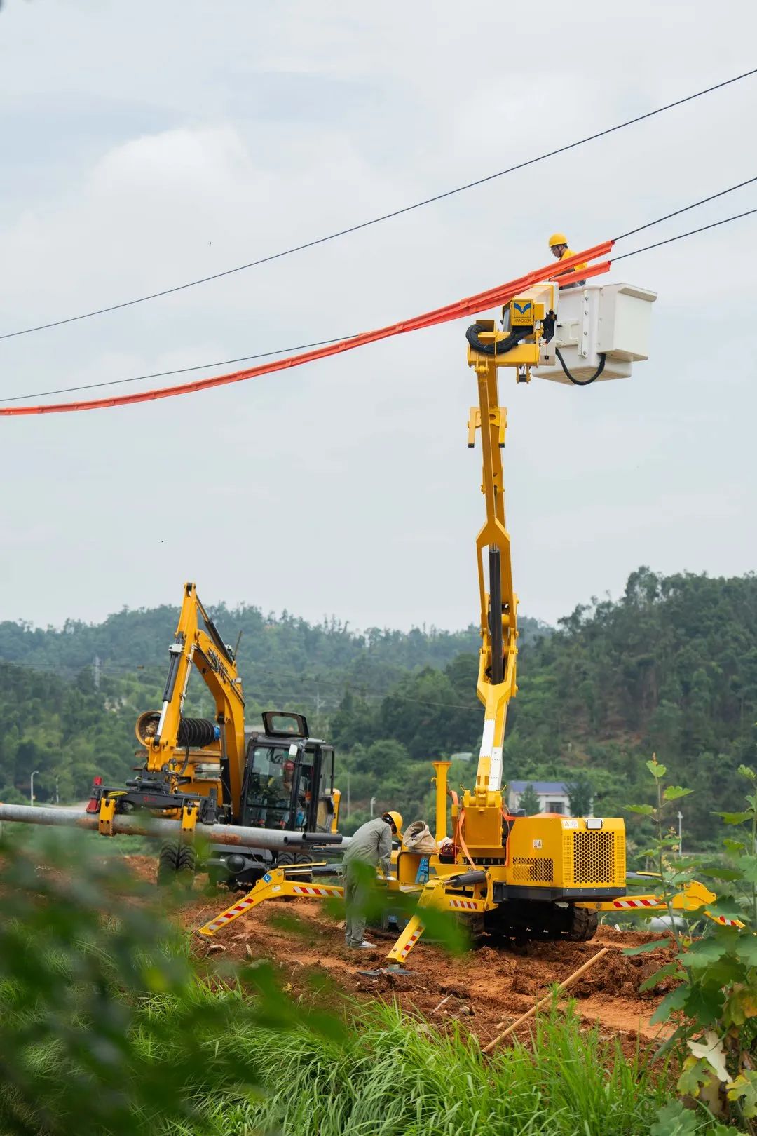 工作人员又操控着履带绝缘斗臂车缓缓驶过田地,到达需立新杆的作业点,随着缓缓升起的绝缘斗,“星城带电护卫”们即按计划在高空熟练地开展各项不停电作业……从立杆、撤杆,到开展不停电作业,整体作业只用了2个小时即完成传统的人工施工8个小时的作业量,工作效率提升4倍。