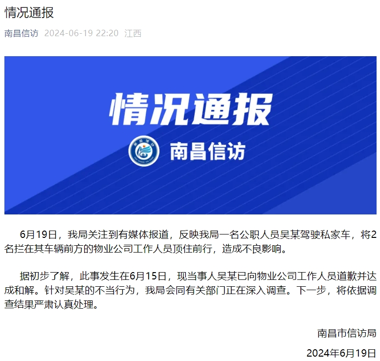 6月19日,我局关注到有媒体报道,反映我局一名公职人员吴某驾驶私家车,将2名拦在其车辆前方的物业公司工作人员顶住前行,造成不良影响。