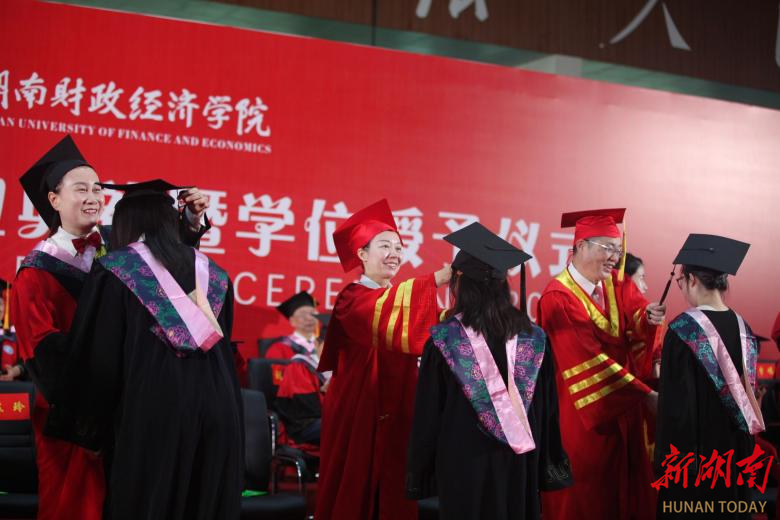 在学位授予仪式上,毕业生们依次走上主席台,全体校领导、相关学院负责人和教授代表为他们一一正冠拨穗、颁发证书,与他们亲切交谈,合影留念。