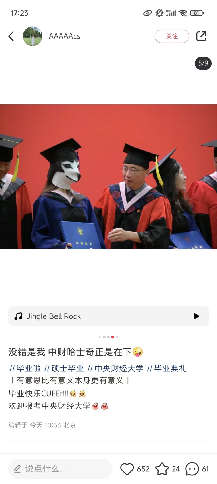 无独有偶,在中央财经大学的毕业典礼上,也出现了一位coser,不过她cos的是一只哈士奇。这位网名是@AAAAcs的女硕士,戴上了一个哈士奇头套参与毕业典礼。拨穗的导师虽然满脸震惊,还是保持了优雅的风度为这位弟子拨穗。