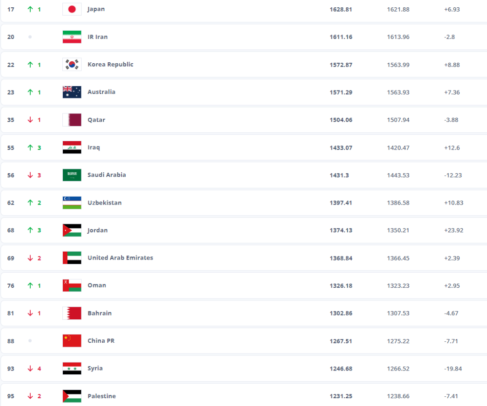 国际足联20日公布新一期男足排名,亚洲前三为日本队、伊朗队、韩国队。中国队积1267.51分,名列世界第88位、亚洲第13位。