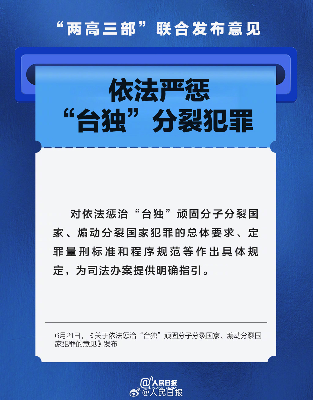 今天,《关于依法惩治“台独”顽固分子分裂国家、煽动分裂国家犯罪的意见》发布。其中明确“实施本意见第二条规定行为的,对首要分子或者罪行重大的,处无期徒刑或者十年以上有期徒刑,其中对国家和人民危害特别严重、情节特别恶劣的,可以判处死刑;对积极参加的,处三年以上十年以下有期徒刑;对其他参加的,处三年以下有期徒刑、拘役、管制或者剥夺政治权利。”
