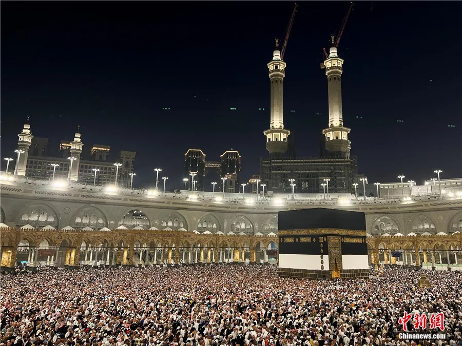 图为2024年6月18日,沙特阿拉伯麦加,穆斯林朝觐者聚集在麦加大清真寺。