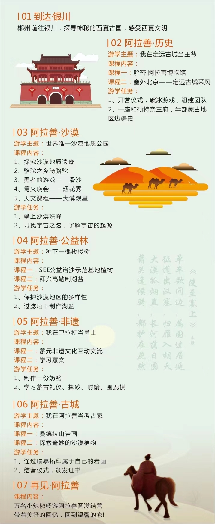 在阿拉善,“小辣椒”可以在专业向导的陪同下,近距离接触神奇的骆驼。学习骑乘技巧,骑上骆驼穿越沙漠,领略壮丽风光。还可以亲手挤驼奶,了解其营养价值,深刻体会骆驼对当地人民生活的重要性。此外,还能参与到骆驼保护活动,观察它们在自然环境中的生活状态,为其栖息地清理与保护、监测种群数量等贡献力量。通过这些与骆驼的互动活动,更深入地了解阿拉善的自然景观、生态环境及独特的骆驼文化,丰富知识,培养环保意识,感受人与自然和谐共生的重要性。