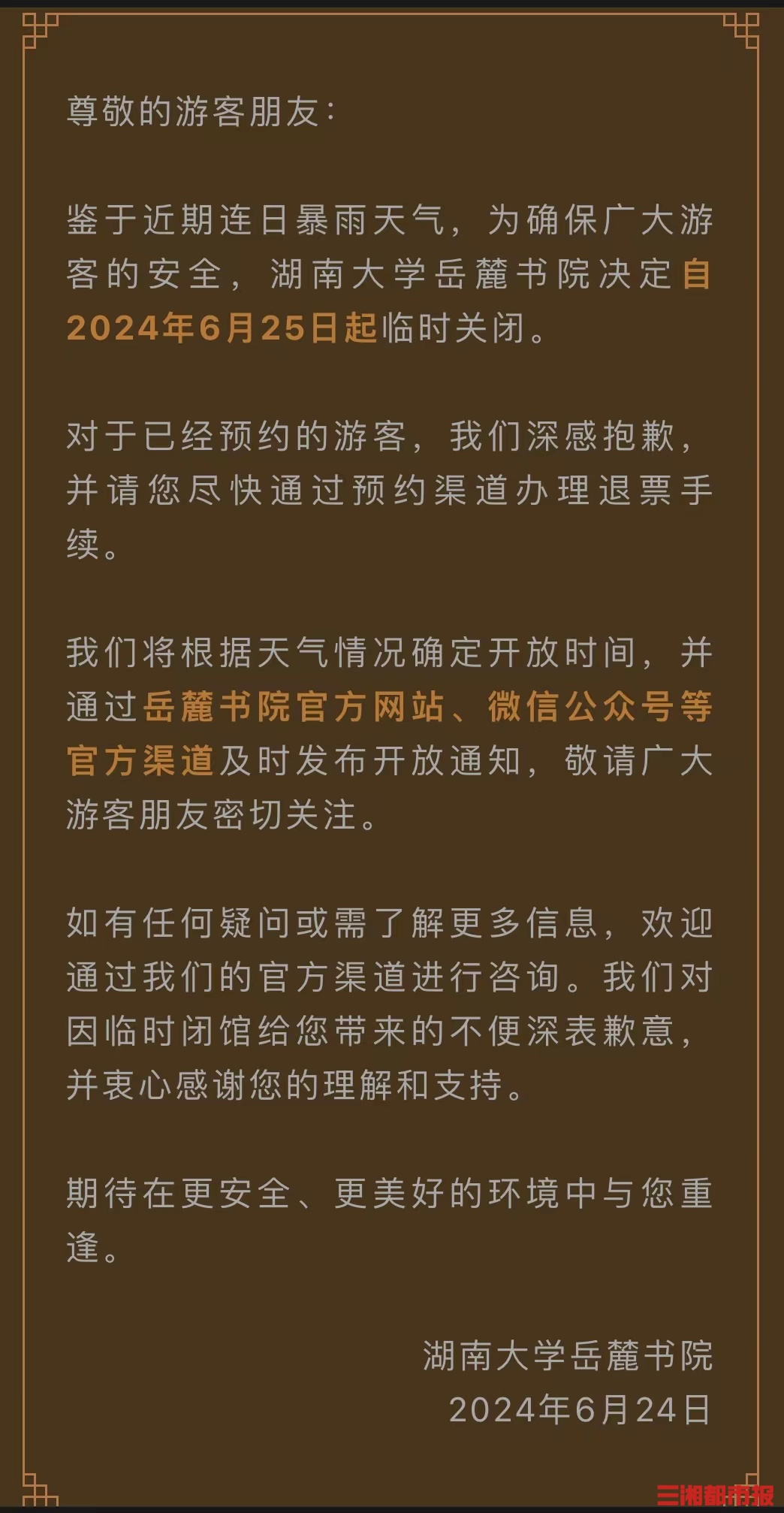 三湘都市报·新湖南客户端6月24日讯(全媒体见习记者 曾冠霖)6月24日,湖南大学岳麓书院发布公告。鉴于近期连日暴雨天气,为确保广大游客的安全,湖南大学岳麓书院决定自2024年6月25日起临时关闭。对于已经预约的游客,将通过预约渠道办理退票手续。