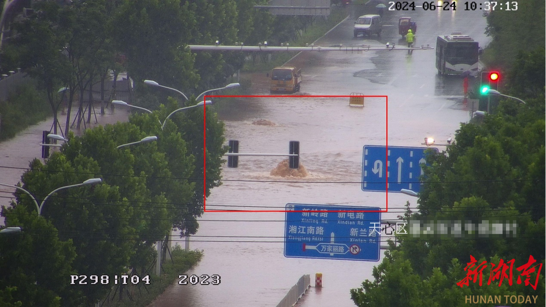 “铁塔哨兵”实时监测画面:长沙市天心区某路段严重积水,影响交通出行