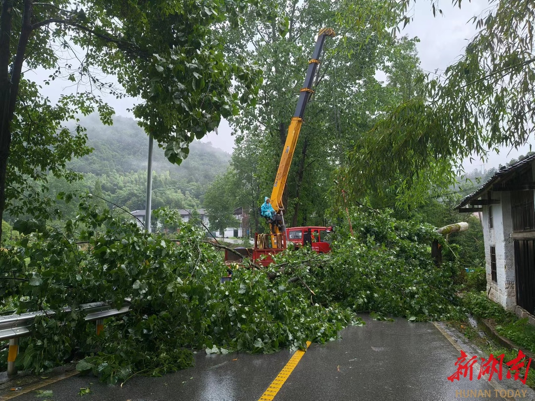 (6月23日下午3点20分左右,浏阳市张坊镇风力达到了9级,辖区内国道G354有多处大树因风力较大而倒塌,严重影响了交通出行秩序。该镇综合执法大队立即组织人员、机械对倒塌的树木进行清理,现己恢复交通)