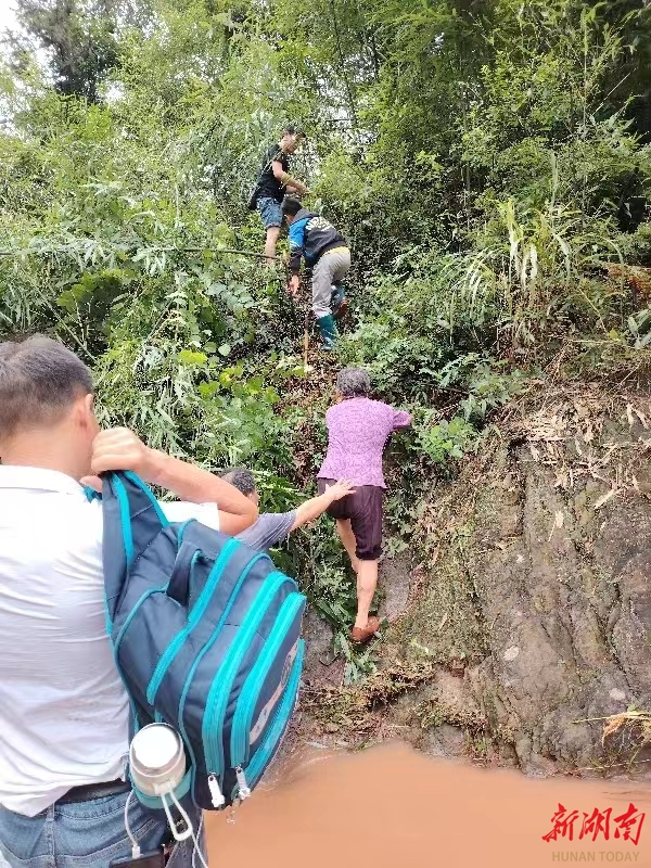12组一处道路被冲垮中断后,13、14、15,3个村民小组被困。得知情况后,傅国权带领8名干群,拿着柴刀,一路辟出便道,翻山越岭走了3个小时,才到达被困村组。“村民冯本枝的家里三面环水,水深已到大腿,冯本枝祖孙站在二楼上,等待救援。我们把他们背到了安全地点。”傅国权说。