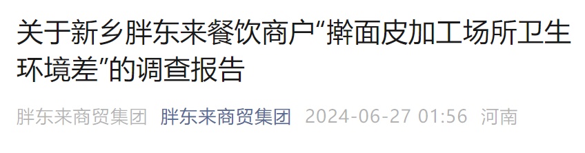 今天(6月27日)凌晨,河南新乡胖东来发布关于餐饮商户“擀面皮加工场所卫生环境差”一事的调查报告,承认顾客反馈信息属实。