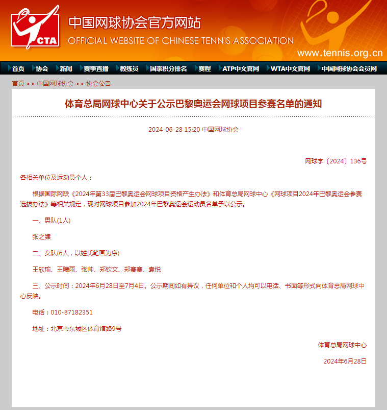 6月28日,体育总局网球中心对网球项目参加2024年巴黎奥运会运动员名单予以公示。