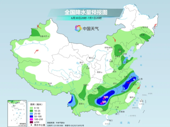 6月30日夜间至7月1日,雨带仍较为稳定。近期强降雨影响范围广,长江中下游地区及广西北部等地雨量大,中小河流洪水、山洪、地质灾害的气象风险高,还需加强防范。