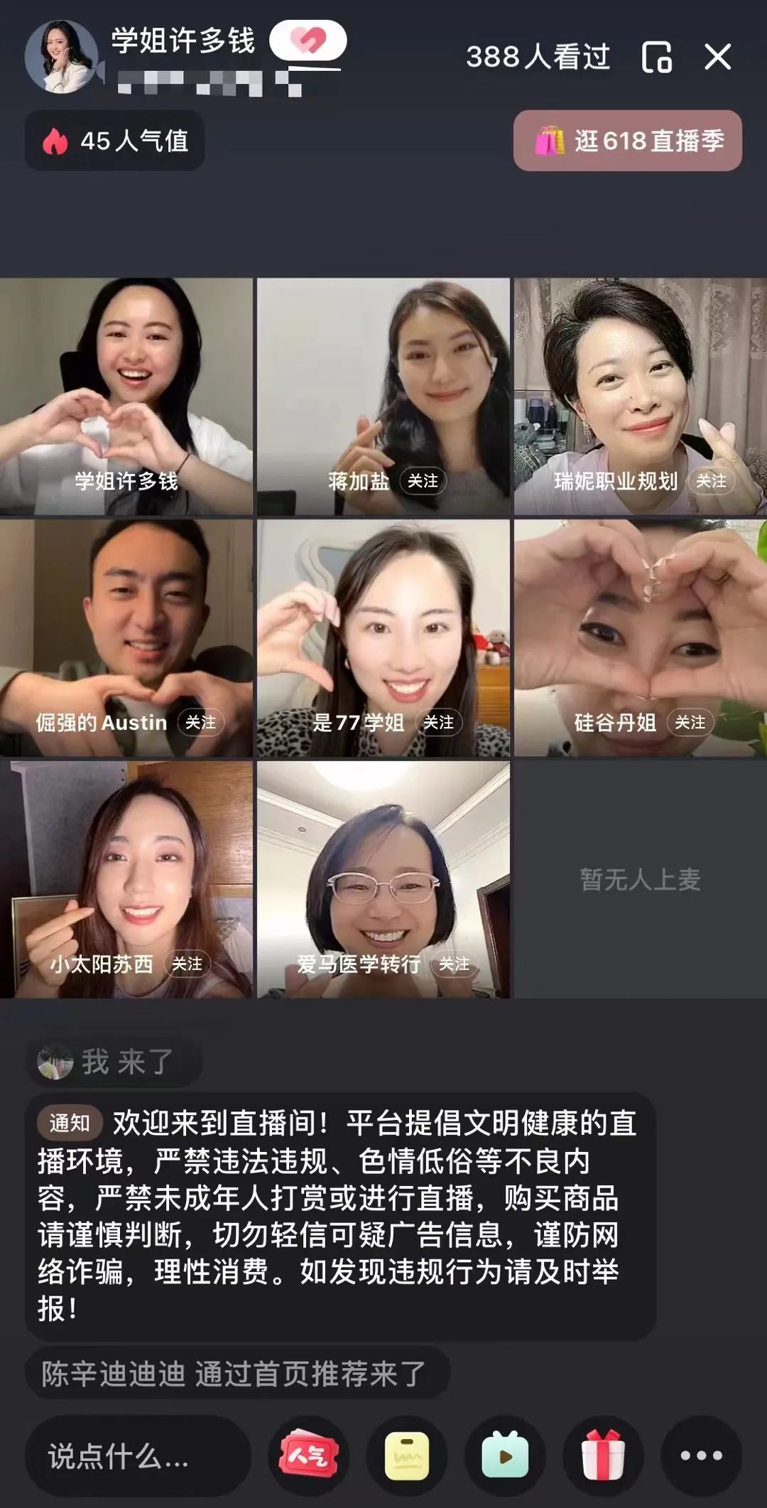 @学姐许多钱和不同自媒体博主直播聊天。( 图/受访者供图)