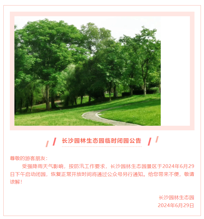 受强降雨天气影响,按防汛工作要求,长沙园林生态园景区于2024年6月29日下午启动闭园,恢复正常开放时间将通过公众号另行通知。