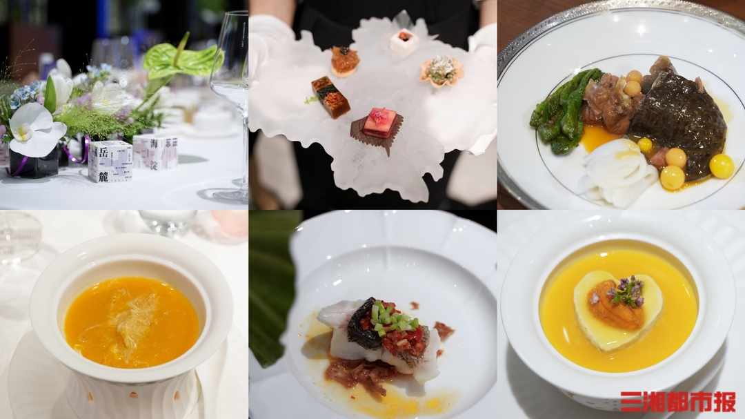 以湖南地图形状为器皿,既有洞庭溏心皮蛋本土手作,又有湖南夏季名小吃桃子紫苏杨梅融合株洲本土紫苏提香,双椒桂鱼冻则是本地桂鱼糅合老坛剁椒与晒青椒的杰作……前菜锦绣5冷拼出场高开,黄焖汉寿甲鱼、酸辣鱼翅、海胆祖庵豆腐、荷香紫油姜蒸笋壳鱼等菜品依次呈现,让宾客大快朵颐。