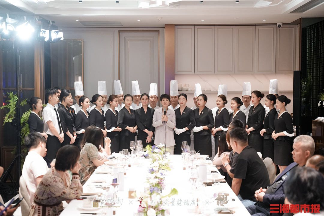 “鸭皮特别酥脆、低脂特别少油、肉嫩特别多汁。”在伍厚德堂新锦轩餐饮公司副总经理黄涵的介绍下,大董酥不腻烤鸭5.0以位上菜端上桌,烤鸭搭配鱼子酱及秘制蒜香黄油呈现,这道“一招鲜”的镇店之宝引宾客围观。大董表示,湖南气候湿润,在长沙做烤鸭的难度很大,但这道鸭子的呈现让他看到了钻研及传承湘菜文化的匠心,看到了北京烤鸭与湘菜的完美融合,“长沙餐饮界可以走出新风尚。”