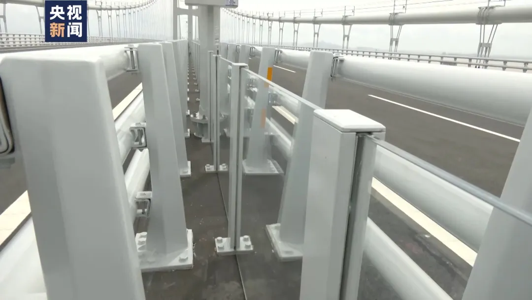 总台央视记者 曹丹:在深中大桥的桥面中心位置,隐藏着一道玻璃墙。看上去就是一块块普通的钢化玻璃,但是它们却是深中大桥抗风的“秘密武器”。