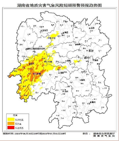 根据地质灾害成灾规律和孕灾条件,结合2024年6月30日短期气象预报情况,省自然资源厅与省气象局联合会商得出如下结论:自6月30日20:00至7月1日20:00,受降雨影响,湘西南、湘中部分区域发生突发性地质灾害风险高(橙色预警),湘中、湘西部分区域发生突发性地质灾害风险较高(黄色预警)。