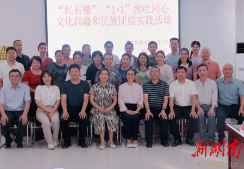 新湖南客户端6月28日讯(通讯员 黄武 杨艳)为深化湘吐两地教育领域的交流与合作,进一步推动民族团结与文化润疆工作,6月22日至6月26日,隆回县人大常委会副主任胡江南、隆回县第二中学校长廖敦燕率队,携同教科室主任聂翰贤、教师杨艳和曾桂花一行前往新疆吐鲁番鄯善县迪坎镇希望学校,开展了“红石榴”·“1+1”湘吐同心共建文化润疆和民族团结实践活动。