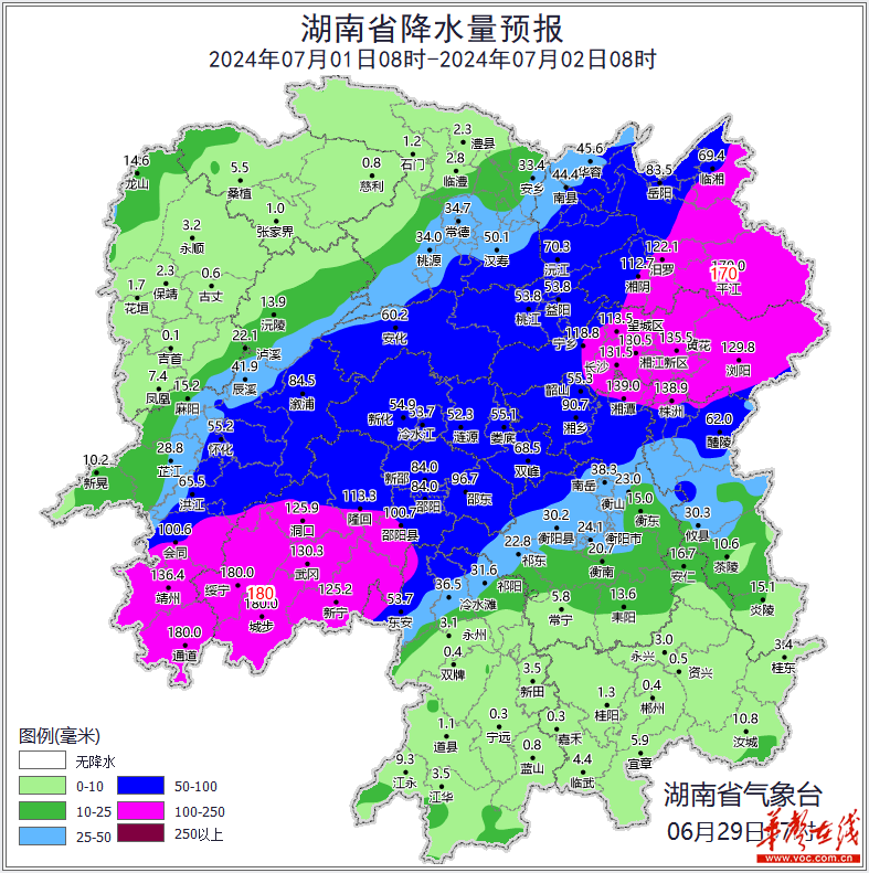 根据湖南省气象台预报,今天(6月29日)至7月1日受高空槽、切变线、西南暖湿气流共同影响,湘中、湘北地区有大到暴雨,局地大暴雨,单点特大暴雨,并伴有短时强降水、雷暴大风等强对流天气。